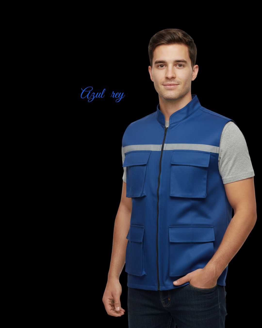 Chaleco en drill importado de alta resistencia, ideal para dotación empresarial en sectores industriales, logísticos y de servicios.